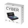 Бездротовий зарядний пристрій з годинником Cyber. Безпровідна зарядка смартфона. Рекомендовано заряджати через блок живлення QC3.0 quick charge. Шнур живлення зарядного пристрою в комплекті. Зарядний пристрій забезпечує вихідну потужність 15 Вт та інтелектуально регулює вихідну потужність від 5 до 10 Вт, залежно від потреб енергоспоживання пристрою. Цифровий годинник живиться від літієвої батареї. Годинник має LED-екран з можливістю відображення часу у форматах 12 годин та 24 години, вбудований календар та термометр. Через USB вихід можна одразу зяряджати і другий пристрій.