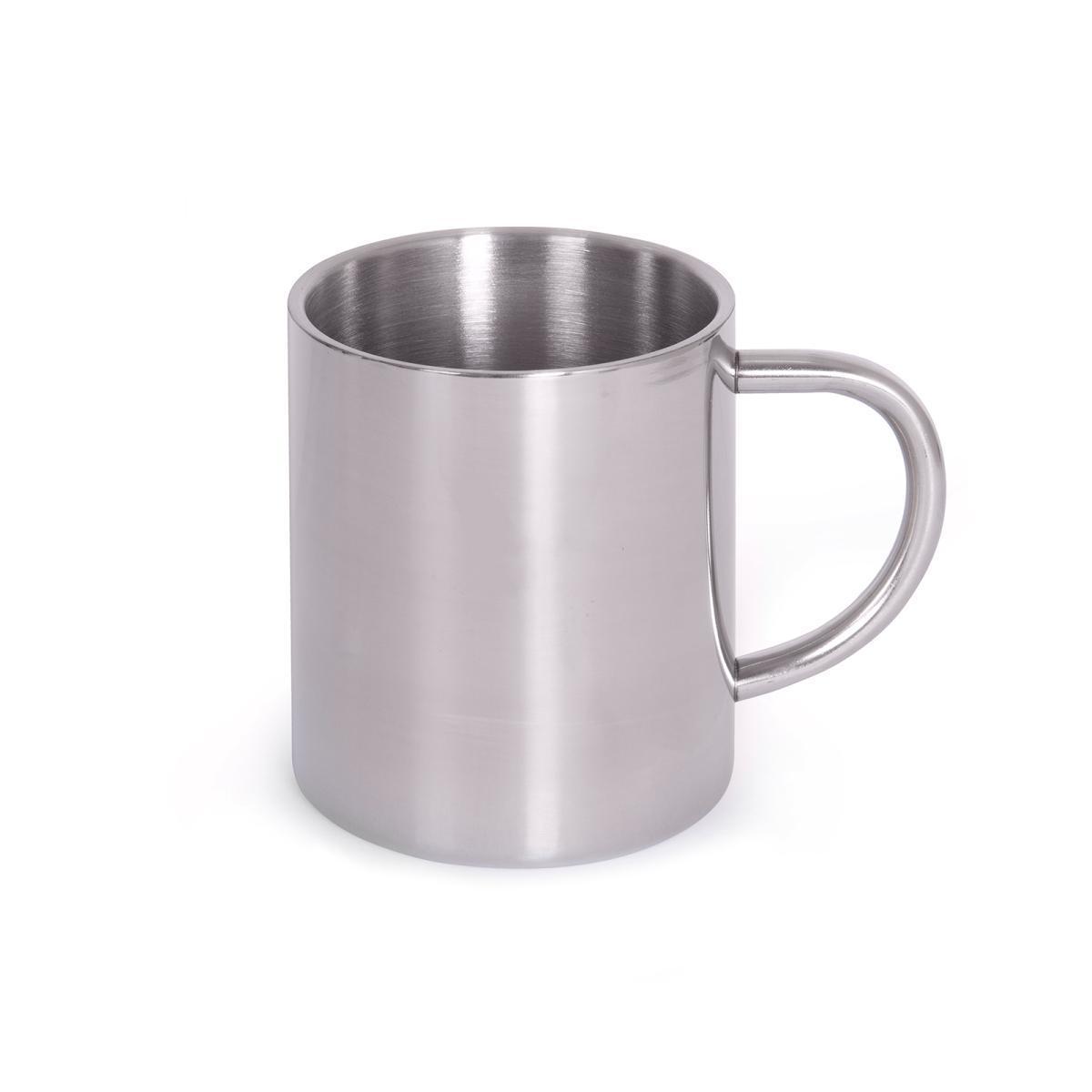 Кружка металева з двома стінками: срібляста - з глянцевим покриттям, кольорові (чорна, синя, олива) - з матовим покриттям. Висота 9,4 см