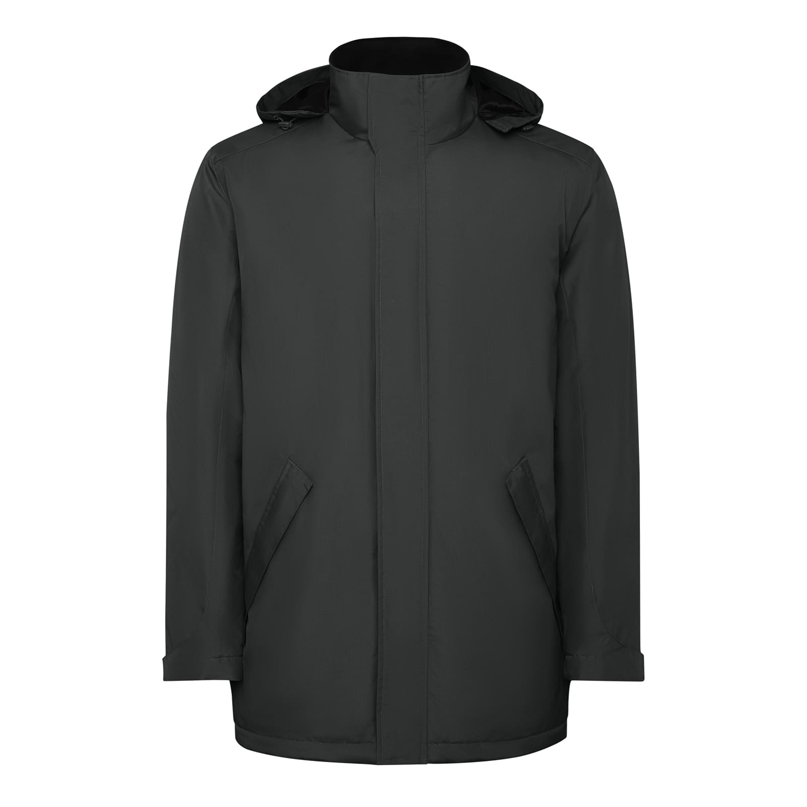 Пухова куртка-парка з від'єднуваним капюшоном та еластичними регуляторами. Водонепроникний матеріал. Спереду блискавка, що прикрита широкою планкою з того ж матеріалу. Манжети з регулятором на липучці. Бічні кишені з відповідними блискавками, прикриті планкою з тканини. Внутрішня кишеня ліворуч. Внутрішній доступ для персоналізації.